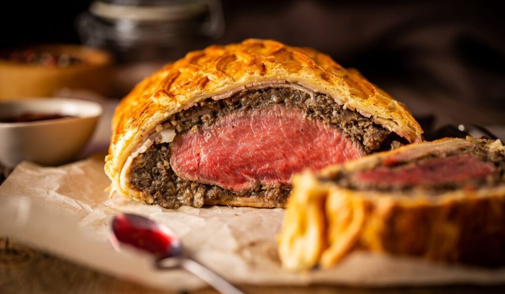 - Wrap the beef in puff pastry, seal edges, and brush with egg wash.
